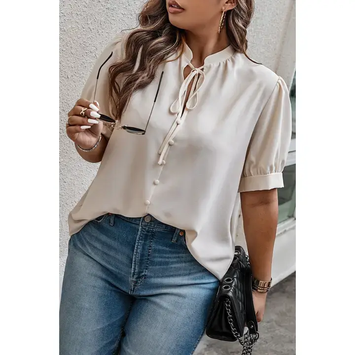Plus Size Cross Neck Puff Sleeves Solid Button Top